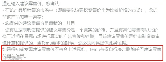 目前并无卖家因填写建议零售价不当而被处罚的案例,最坏情况仅为所填价格不显示。平台后台说明仅提示“Temu有权删除相关建议零售价信息”,因此卖家无需过度担忧。