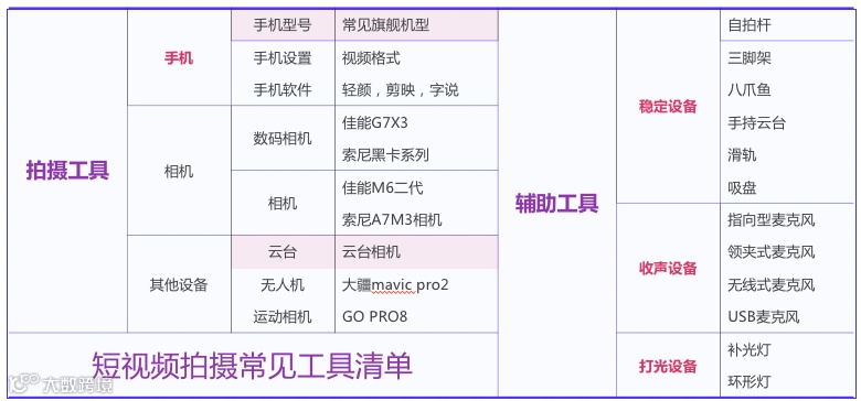 - 辅助工具:稳定器、三脚架、补光灯、指向型麦克风等