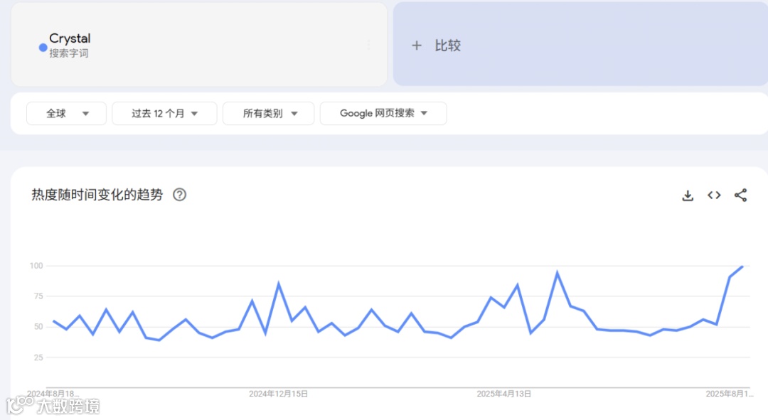 与水晶有关的产品,如水晶树、水晶原石、水晶饰品等在海外都很畅销。谷歌趋势数据显示,过去一年,“crystal(水晶)”一词全球范围内搜索热度持续在45—100之间,全年都处于热销期。