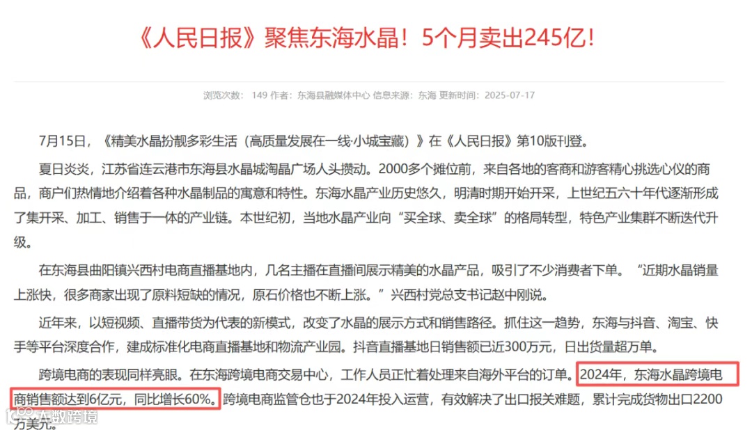 中国卖家一场水晶跨境直播,每天四到六个小时,保底有两万美金的销售额。世界水晶之都东海县,更是靠卖水晶,5个月卖出245亿。