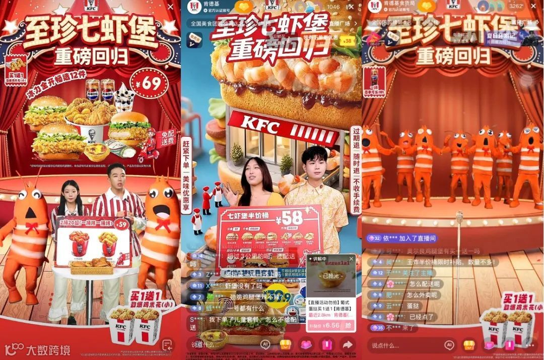 肯德基也借此路径,减少了效率磨损。这个暑期,肯德基“至珍七虾堡”回归,品牌方在直播间中为该品配上了魔性的“虾头舞”,不仅有大虾的群舞,两名主播在直播时,旁边也配上了大虾跳舞的虚拟背景,视觉与情绪双重拉动,十分洗脑。
