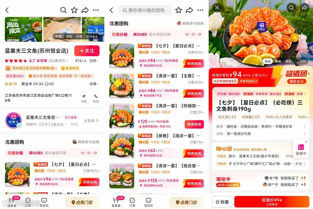 这一点,对于强调“新鲜”“即食”鲜食品牌而言,助力不小。如主营海鲜刺身的品牌蓝塞夫,暑期主推“三文鱼+甜虾”套餐,通过随心团开放了“核销、到家”双通道,并将价格打到了原团购价格的84折。