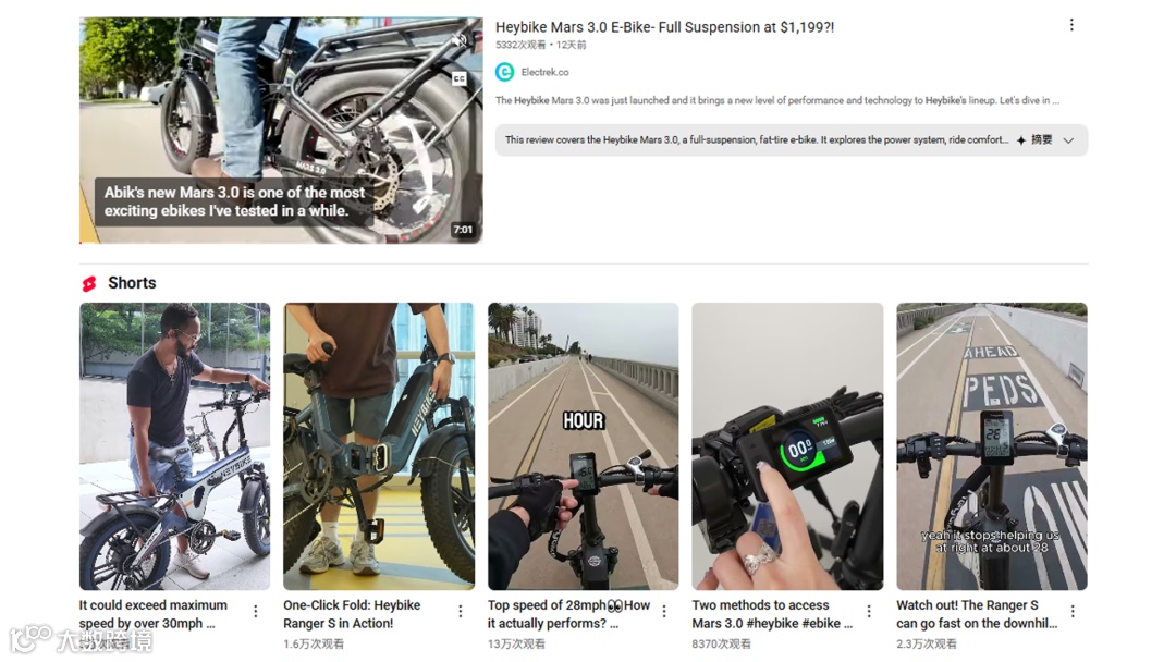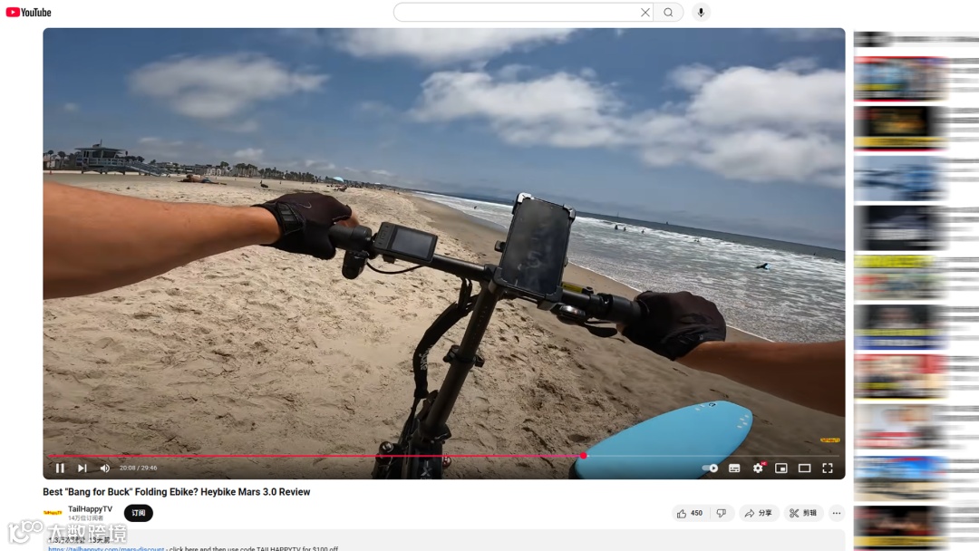 视频如标题所示:《性价比最高的折叠电动车?Heybike Mars 3.0 评测》,视频中,TailHappyTV不仅测试了电池重量,让观众直观感受搬运和折叠的便利性,还在沙滩和沥青路上进行骑行实测,展示了这款车在不同路况下的性能和稳定性。