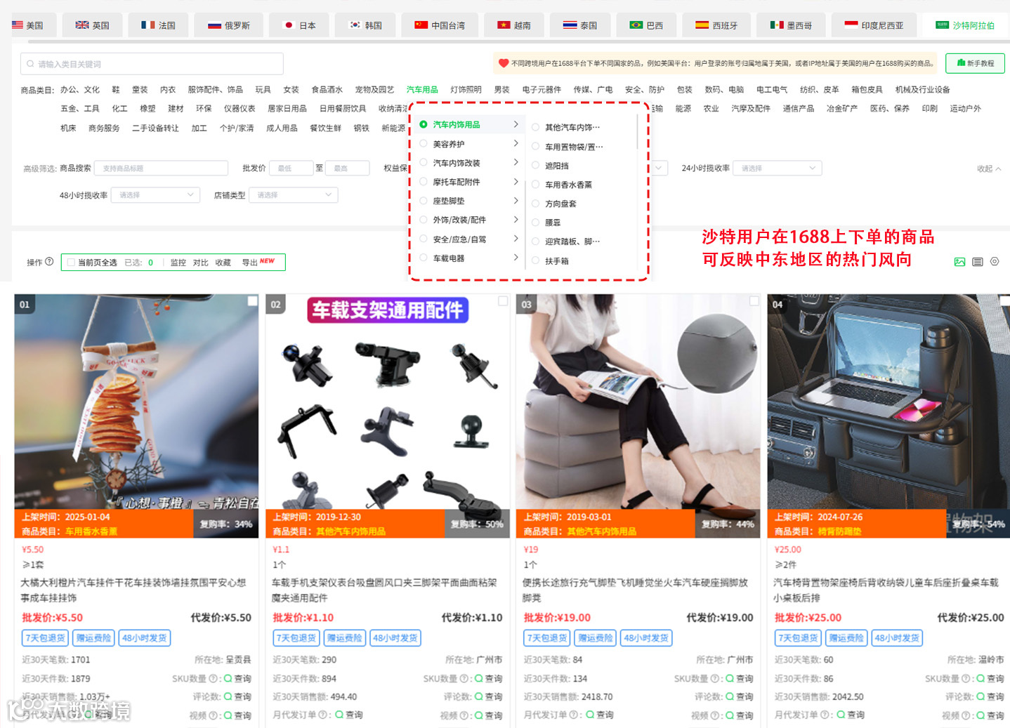 卖家可通过热门国家货盘,查看沙特阿拉伯国家的商品数据,例如选择汽车用品类目(最高可到三级),这里会展示沙特用户在1688上下单的产品,可反映中东地区的热门风向,给予卖家选品灵感。