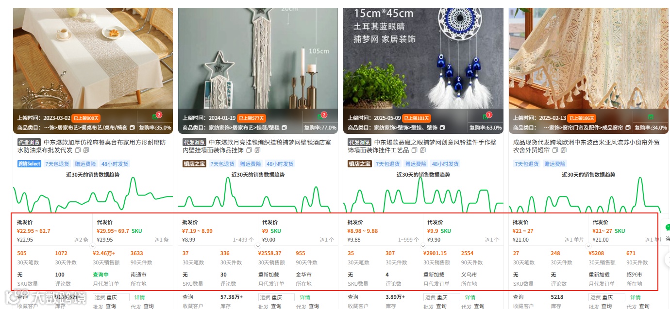 对于桌布、装饰品这类体积小、重量轻的产品对新手较为友好,可通过店雷达选品工具进行高效选品,比如选择家居家纺类目,关键词输入“中东”等地域词语精准匹配,即可找到具有本地特色的货源商品。