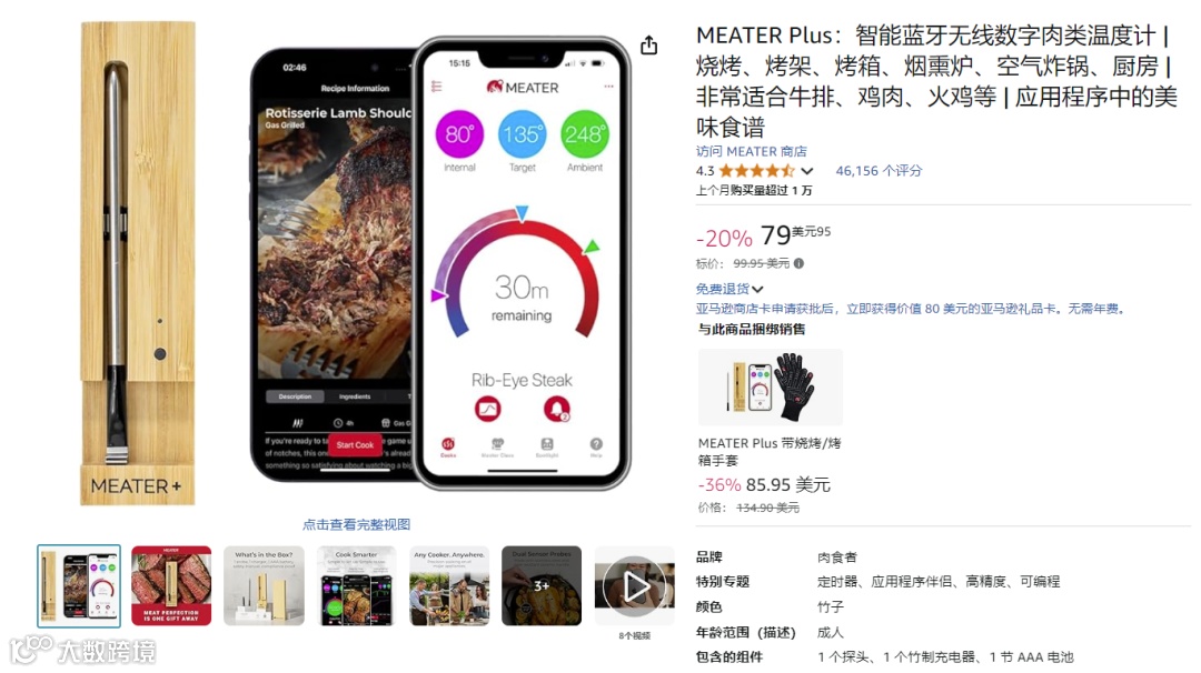 美国的烤肉文化尤为盛行,基于此长针式温度计在亚马逊常年位列热销榜。如今智能家居的风也猛烈刮向烤肉界,英国本土品牌MEATER的蓝牙无线温度计单月销量已超过1万件,跻身细分类目Top 3。