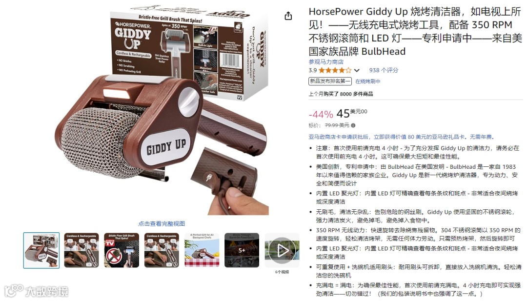 该款电动清洁刷来自本土品牌BulbHead,售价45美元,月销已达8000件且增长势头强劲。配备不锈钢滚筒和LED灯是产品的最大亮点,尤其适宜夜间清洁使用,详情页显示目前产品专利正在申请中。
