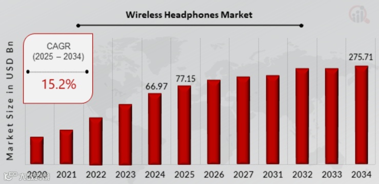 Market Research Future数据显示,2024年全球无线耳机市场价值为669.7 亿美元,预计到2034年将达到2757.1亿美元,2025年至2034年的复合年增长率为 15.2%。