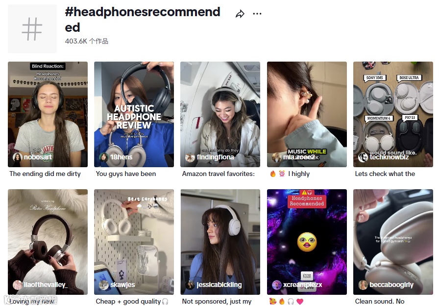 TikTok上,蓝牙耳机种草视频非常多,网友热衷于将好用的3C产品分享到社交媒体上。其中#headphonesrecommended(耳机推荐)标签下作品超40.3万条,#wirelessearbuds(无线耳塞)标签作品超56.36万条,越来越多中国蓝牙耳机在海外热销。