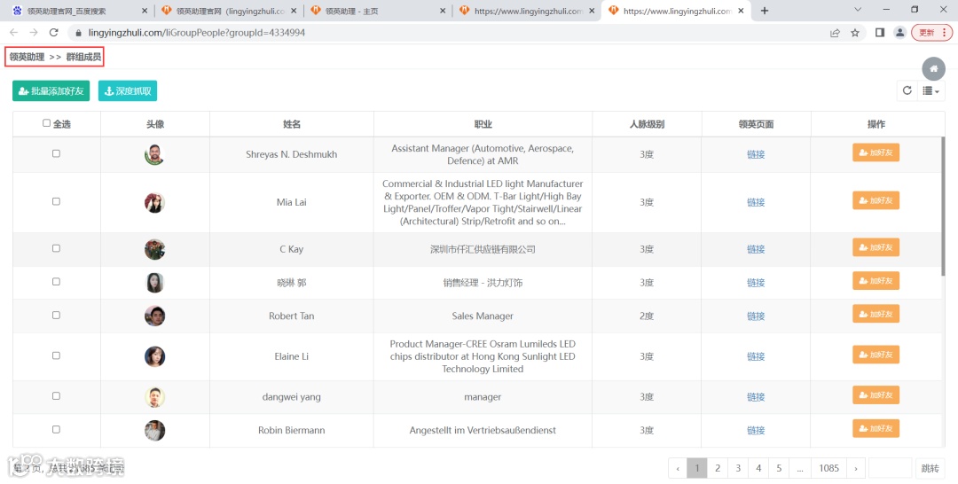 如果想要突破这个限制,使用领英辅助工具领英助理(www.lingyingzhuli.com)是一个很好的选择。其实我建议一开始就利用领英助理去开展工作,因为它可以解放双手,节省时间,安全批量的替代手工执行持续性在LinkedIn(领英)添加好友。