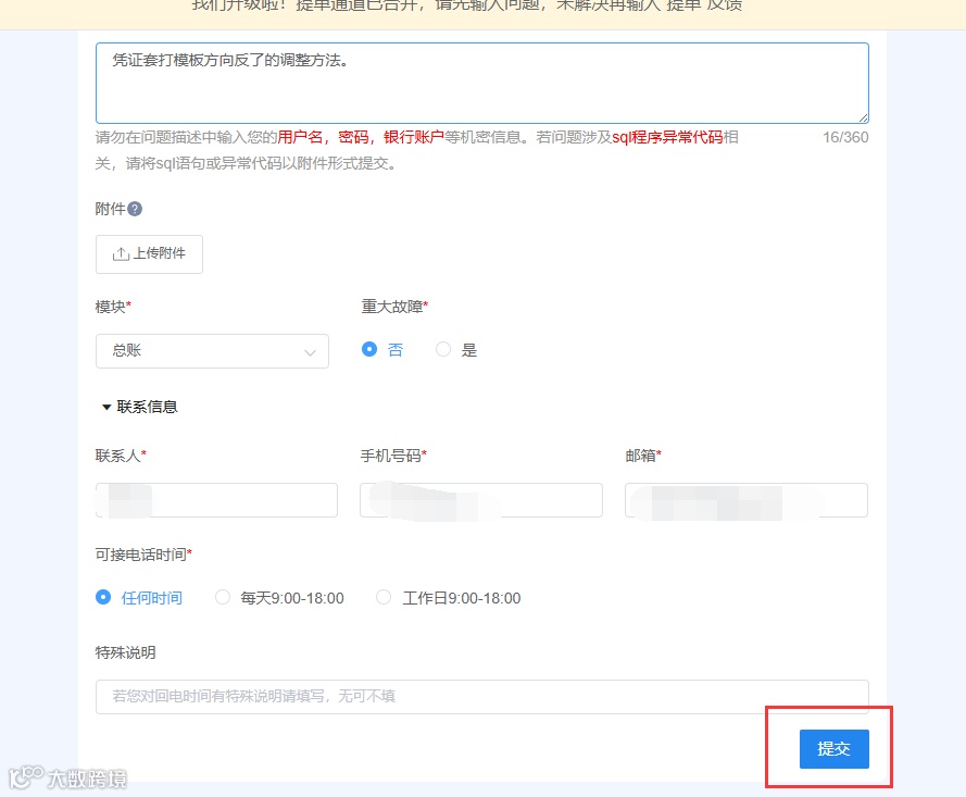 (3)最后填写 “联系信息”(联系人、手机号码、邮箱),选择 “可接电话时间”,确认信息无误后点击 “提交”,即可完成工单创建。