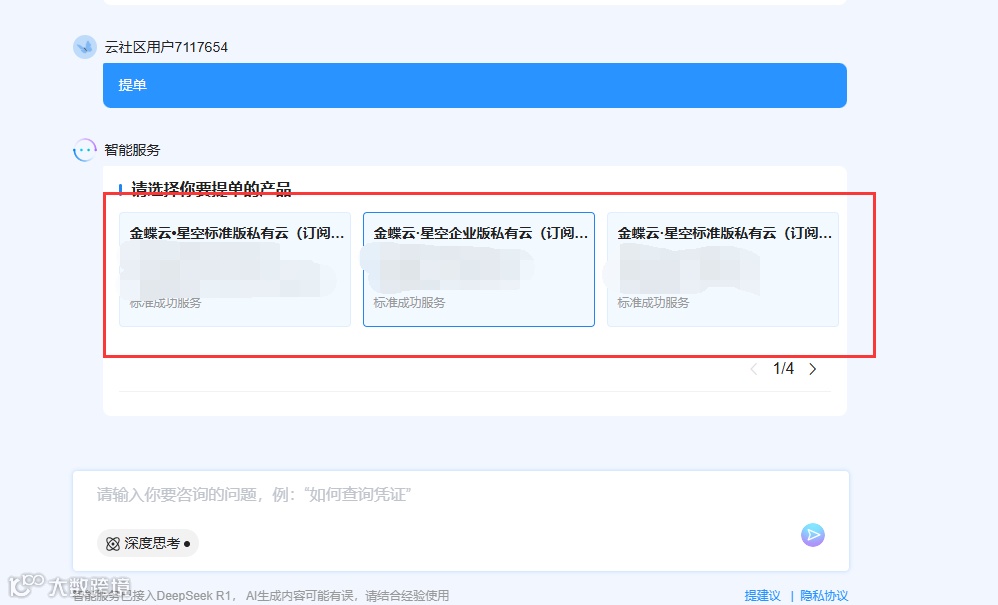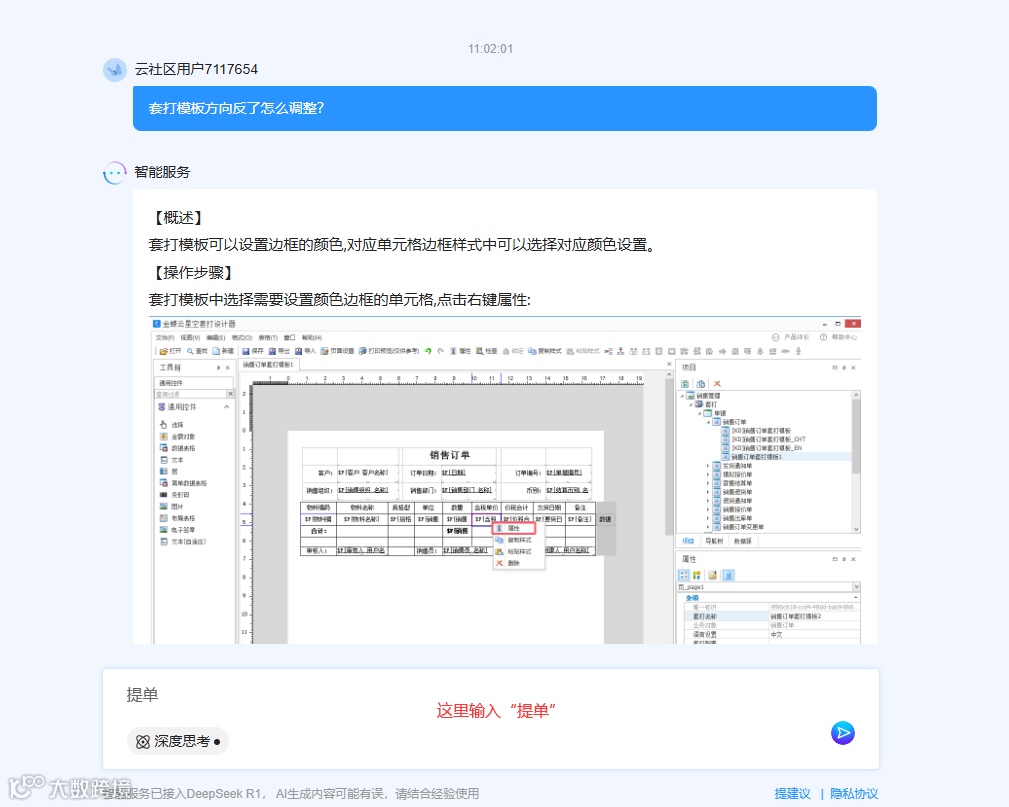 (3)提交问题后,智能服务将基于大模型能力快速给出解答;若对回复不满意,只需在对话框中输入 “提单”,即可进入人工工单提交环节。