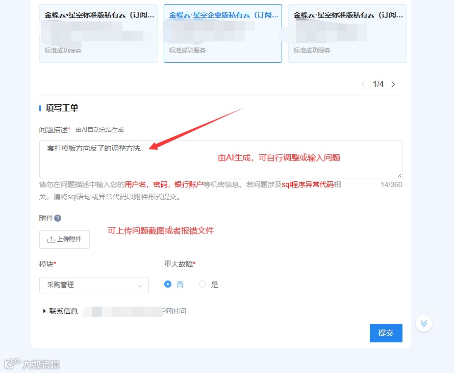 (1)输入 “提单” 后,先选择对应产品,系统会自动根据此前问题生成 “问题描述”,您可按需调整补充;