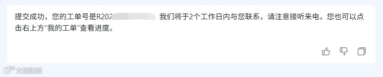 1、工单提交成功后,系统会生成专属工单号,并提示预计回复时间(通常为 2 个工作日内)。