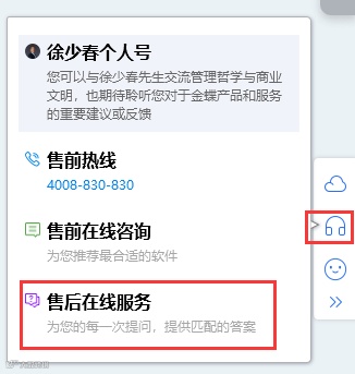 (2)点击 “联系我们”,在弹出的菜单中选择 “售后在线服务”,即可跳转至小 K 服务界面。