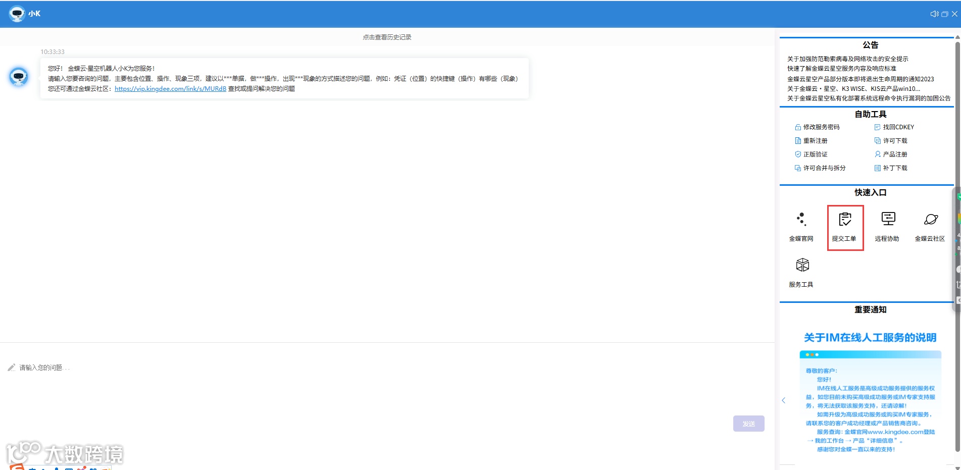 在小 K 服务界面右侧 “快速入口” 区域,点击 “提交工单” 选项,系统将跳转至工单登录界面(若已通过路径二登录,可直接跳过此步)。