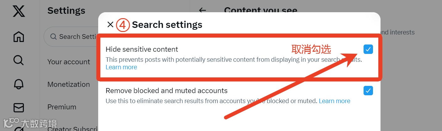 ⑤ 点击“搜索设置(Search settings)”→把“隐藏敏感内容(Hide sensitivecontent)”取消勾选。