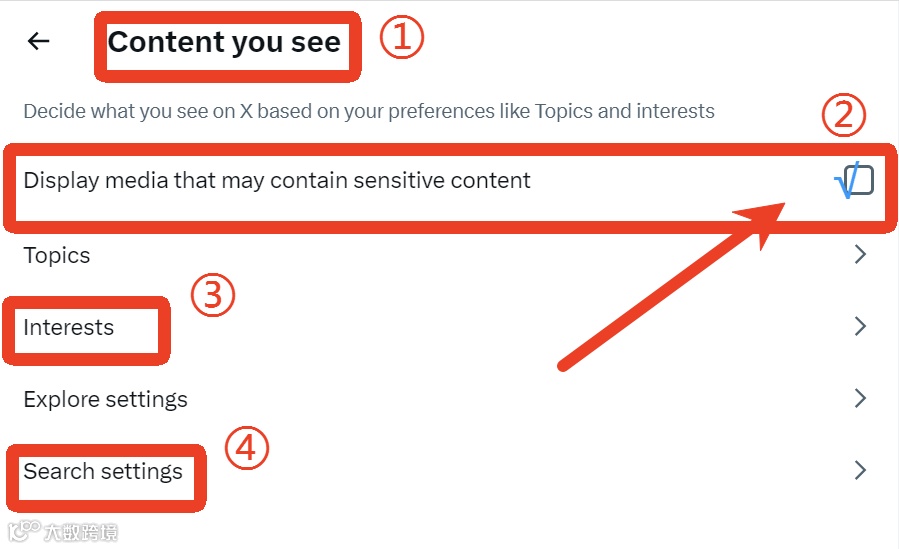 ③ 点击“你看到的内容(Content you see)”→把“显示可能包含敏感内容的媒体(Display media that may contain sensitive content)”选中勾选。