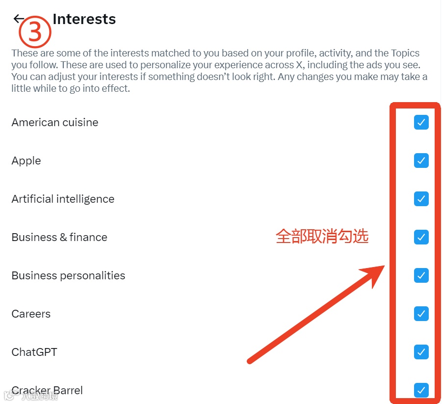 ④ 点击“兴趣(Interests)”→把里面的内容全部取消勾选。