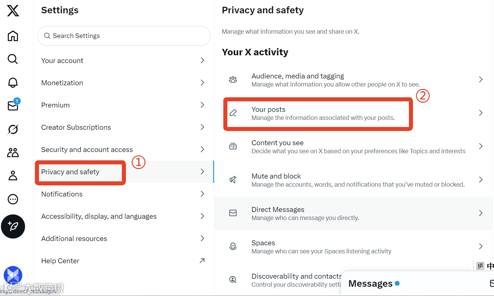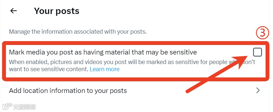 ② 点击“隐私与安全(Privacy and safety)”→“你的帖子(Your posts)”→把“标记为可能包含敏感内容(Mark media you post as having material that may be sensitive)”取消勾选。