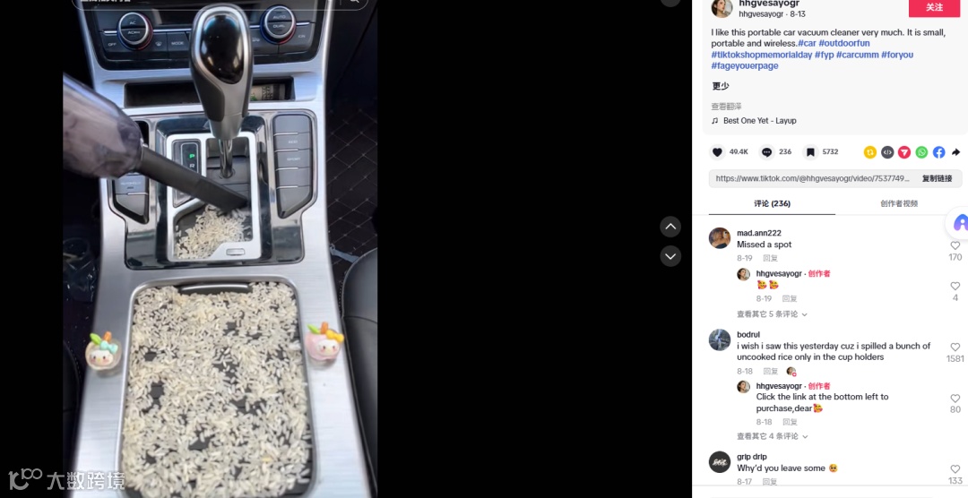 近日,@hhgvesayogr在TikTok上分享使用迷你手持吸尘器清扫汽车内部中控台位置,上面的大米被快速吸进吸尘器内,在汽车狭小隐蔽角落都被清扫的十分利落干净,杜绝清洁死角。这款迷你手持吸尘器瞬间引起轰动,播放量超350万次。