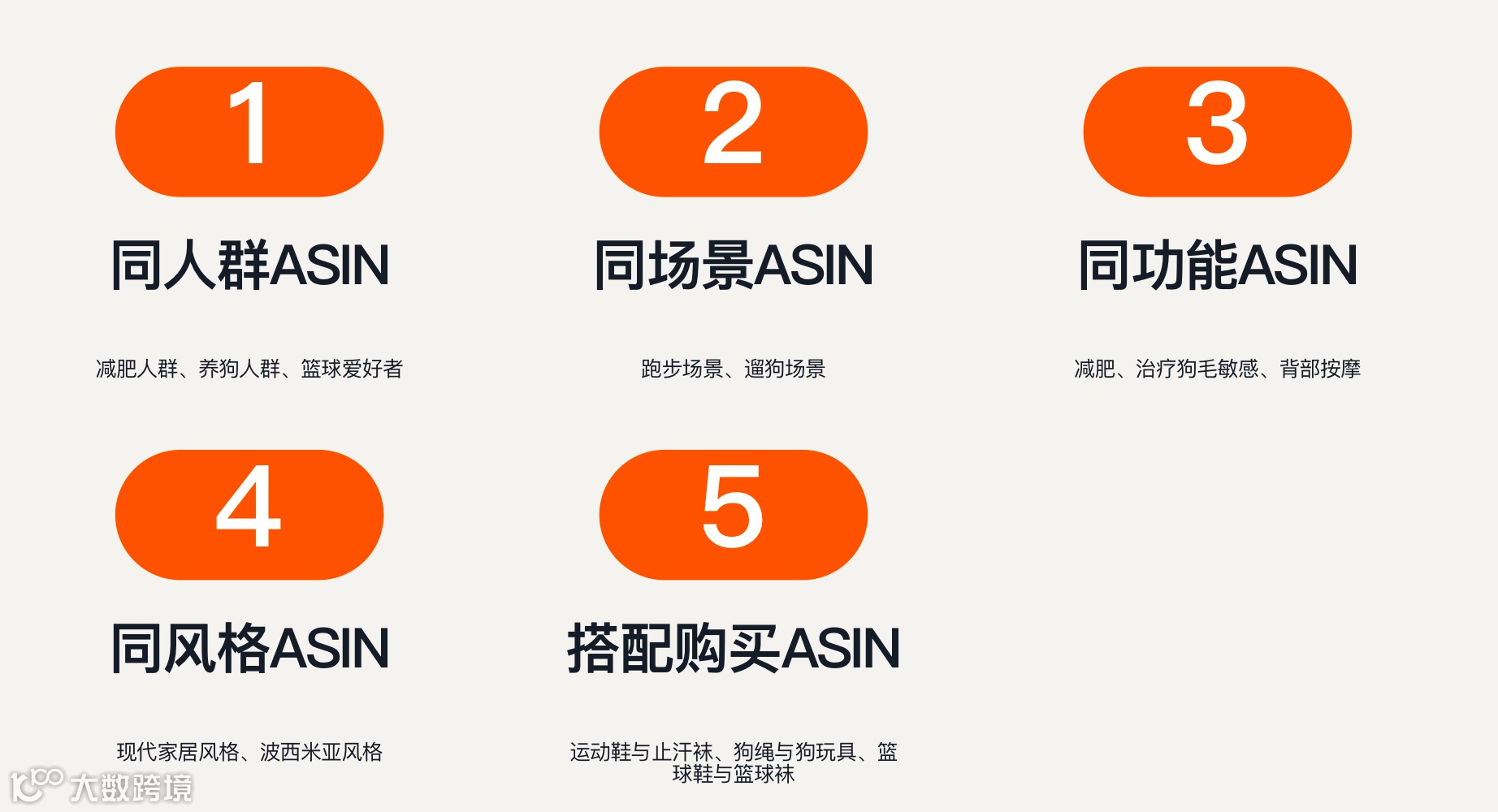 这些ASIN与某一特定产品有强关联性,通常是在用户购买某个产品时,可能会需要或选择购买的其他产品。比如,手机壳和手机膜是互补型商品,呼啦圈和仰卧起坐器材是同功能的产品,狗绳和狗水杯是同场景的产品。通过这些关联,商家可以利用关联ASIN来增加产品曝光。