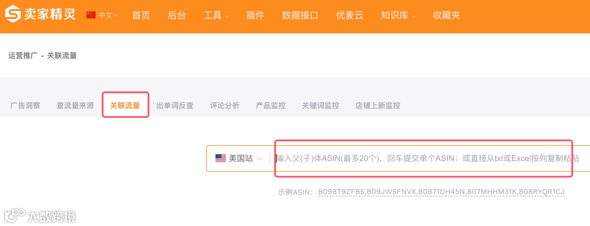 1. 使用卖家精灵的关联流量查询功能,输入排名最好并且相关度最高的20个ASIN进行查询。