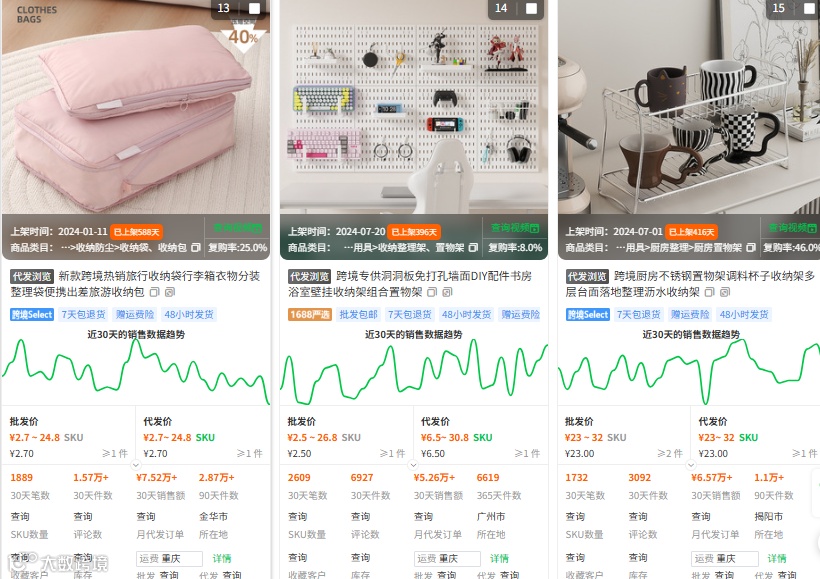 具有环保、便利、多功能、收纳功能的家居用品很受日本用户欢迎。如:可折叠收纳箱、多功能厨房用品、智能小家电、家居装饰等,卖家可通过店雷达1688选品工具,快速找到低价、质量优的源头工厂,通过对比批发价、复购率等数据,选择心仪的供应商。