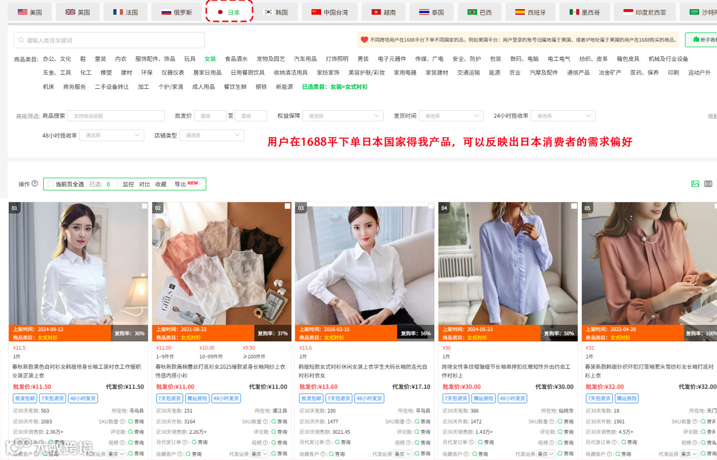 日本人很注重外貌,在职场上也会有这方面的需求,例如女装上的连衣裙、职业套装、衬衫等,男装上的职业西装、休闲装等;款式上偏好简约风,卖家可以从店雷达热门国家货盘中洞察趋势,找到需求点,例如近期女装类目中,简约职场的秋季衬衫较为热销,警示卖家要提前备货好秋冬的保暖产品。
