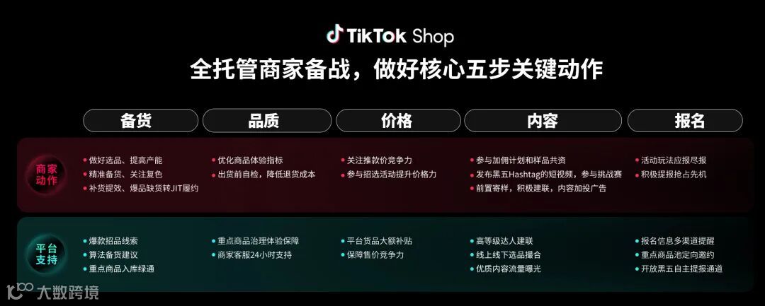 在TikTok Shop全托管黑五商家大会上,平台明确了三大升级方向:商品爆发、场域爆发与经营提效,并提出商家备战“五步走”策略:选好品备好货、提升商品品质、维持价格竞争力、积极参与内容场玩法、积极报名大促活动。