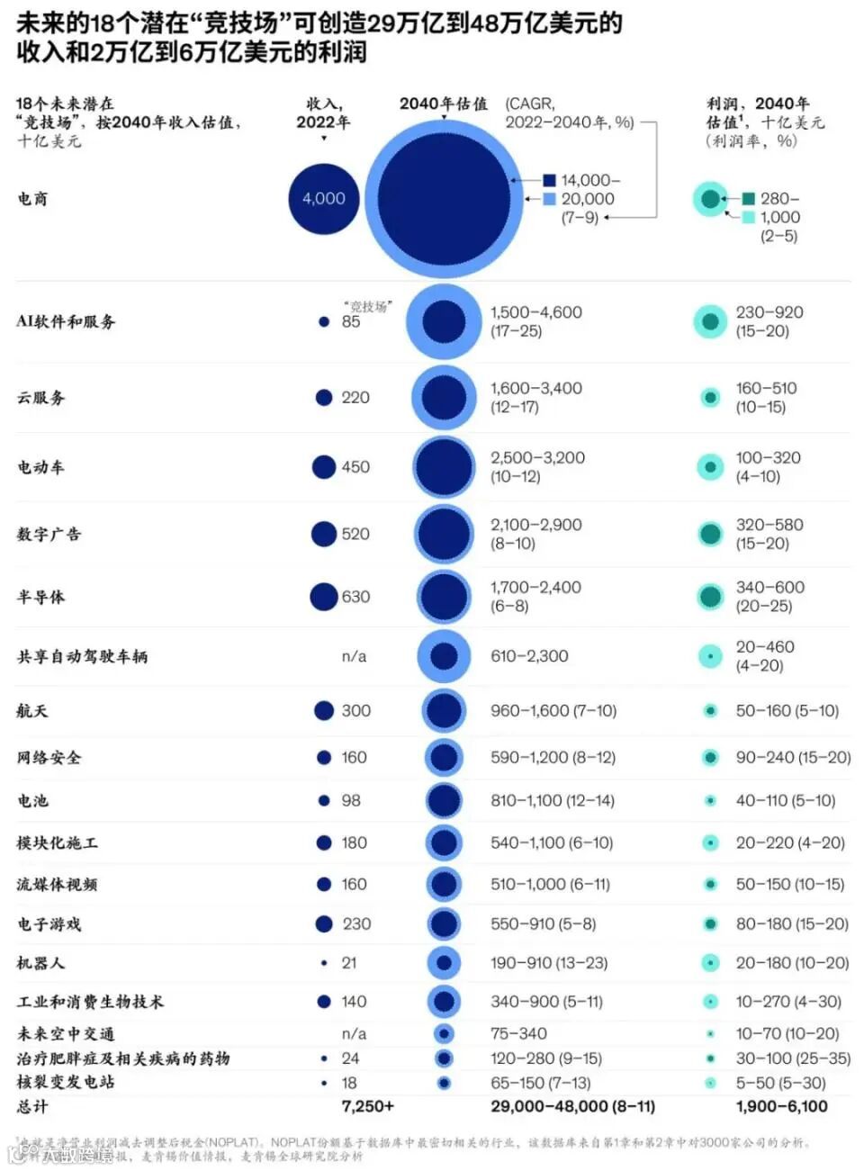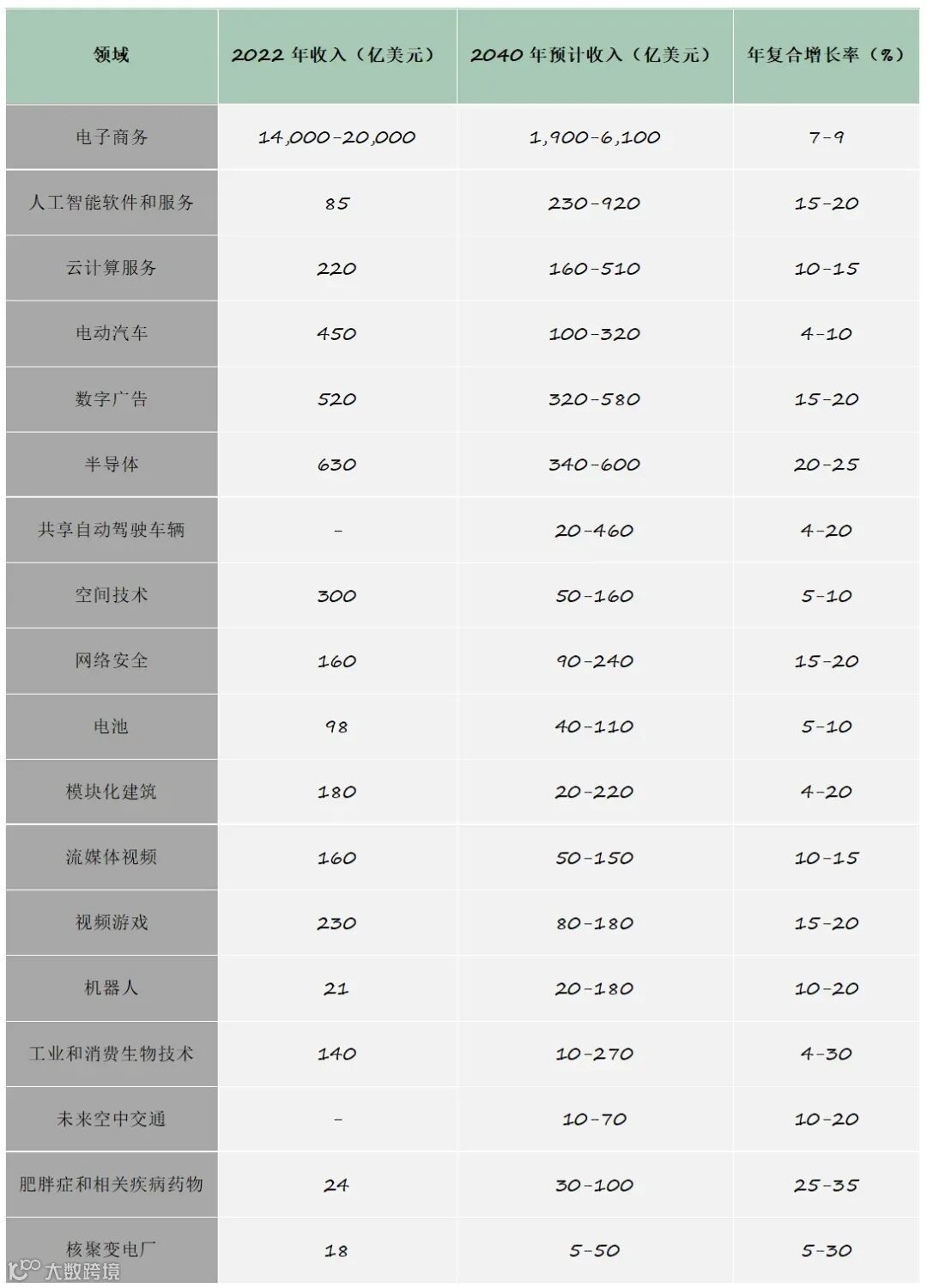 报告指出,从2025年至2040年,这18个关键产业预计将创造出29万亿至48万亿美元的收入,贡献全球GDP增长的三分之一。这些产业涵盖了电子商务、人工智能软件服务、云服务、电动汽车、数字广告、半导体、共享自动驾驶汽车、航天经济、网络安全、电池、模块化建筑、流媒体视频、电子游戏、机器人、工业和消费者生物技术、未来空中交通、治疗肥胖及代谢类疾病药物以及核裂变发电等多个领域。