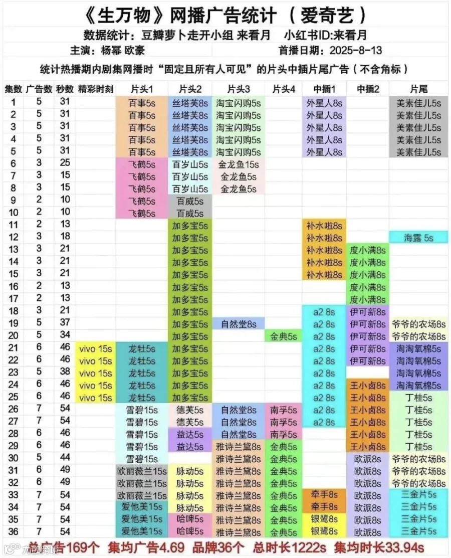 “追爆款”在农村剧《生万物》上体现得淋漓尽致。《生万物》开局5广,播至第11集滑落至2广。但每天3集的排播,加上剧情节奏推进得快,播中期迎来广告主和用户跑步进场。数据显示,《生万物》在第21集后迎来多个品牌追投,其中还不乏自然堂、雅诗兰黛等美妆品牌。