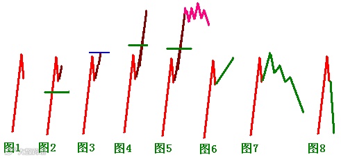 图6是第一式的一个失败图,其表现为上升速度明显被改变了,当然你也可以依照你的看法追多,毕竟趋势还是向上的,但这与我所写的第一式不是一回事了。图7是另一种失败图,你的多单恰好在最高点位成交,不要为此恼火,这是正常的,此时接受亏损,如果你能长期很好的运用此式的话,这点亏损是微不足道的。图8是很少见的一种失败图。价格呈现尖锐V字形反转,此时你应该只下出去了止损单,而开仓单还没有下出去,对你来说不会造成任何实际的损失。