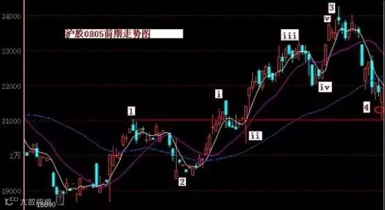 再看上图,这是沪胶0805在07年底的一段走势图。图中可以明显的标注出大浪级别的1、2、3、4浪。其中,第三浪是延长浪。图中最后一个K线处于一个关键位置。依照浪形规则,第四浪不会进入第一浪的价格领地。那么第一浪的高点之下一个点位就构成一个较好的支撑点位。如果我此时做多,请不要批评我逆势而为,因为我有一个做多的较好的关键价格点位止损,就算我看错了,我也会在很小的价格空间中止损出局,不会有太多的损失。我没有任何事后诸葛亮的意思。上面两个图,我都没有将后续的走势画出来,因为后续走势本来对于现在就不是特别重要,重要的是你入场时,有没有找到一个让你满意的止损位。