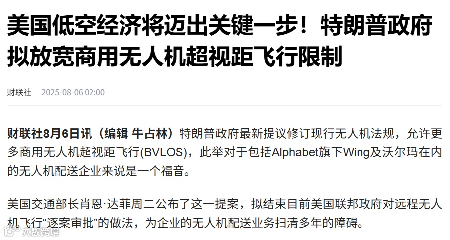 面对中国领先态势,美国于2025年6月发布《释放美国无人机支配地位》行政命令,推动无人机融入国家空域系统,强化本土产业链与全球竞争力。政策松绑将加速Wing、亚马逊等企业布局,Wing计划与沃尔玛合作扩展至100家门店,目标2026年承担其25%的杂货配送。