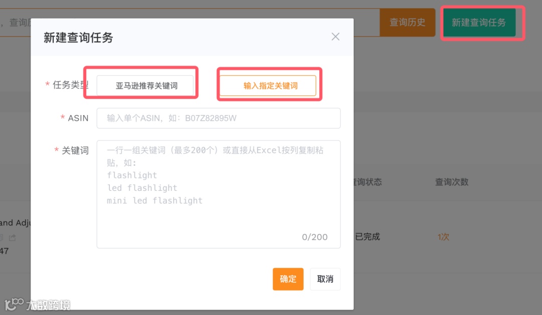 点击新建查询任务,有两种情况,输入Asin,可以直接让系统给出亚马逊推荐的关键词建议竞价,或者输入指定的关键词,每次可查询200个关键词。