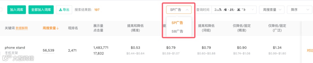 在查询结果中还可以选择广告类型,目前支持SP和SB