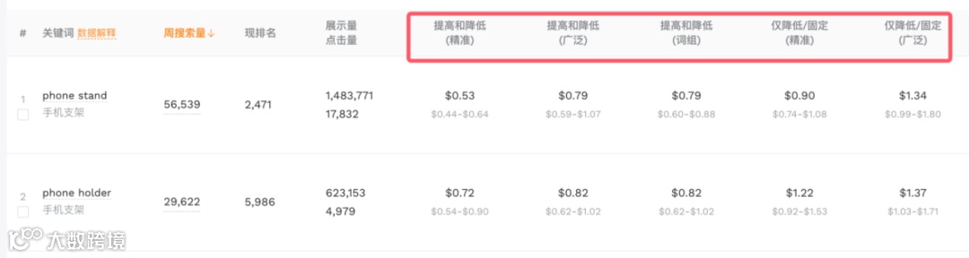 在查询结果中,有提高和降低,仅降低固定三种竞价策略,精准,广泛,词组三种匹配方式,所以可以适配各种广告方案。