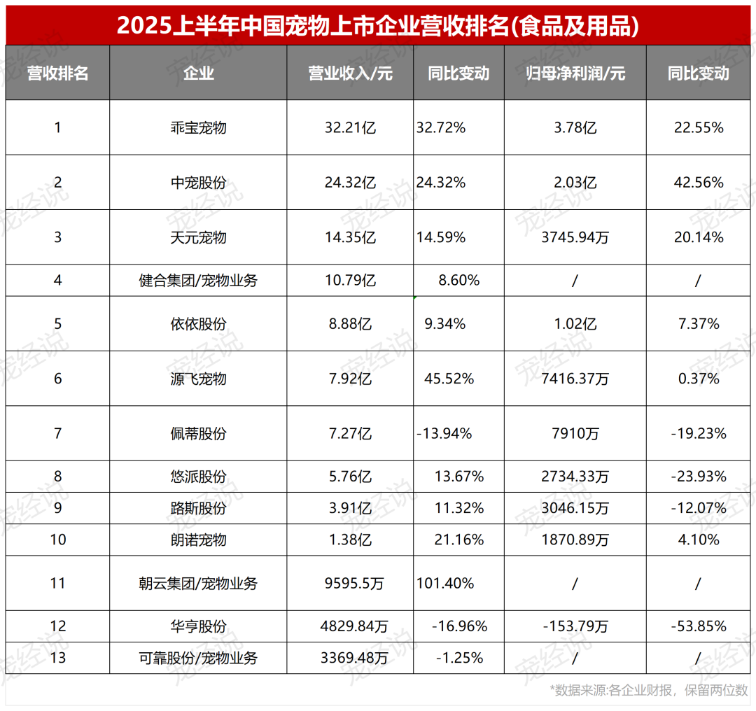 随着各大宠物上市公司半年报的相继出炉,一份全新的行业成绩单展现在我们面前,据此,宠经说根据已经公开的财务数据梳理出2025上半年国内宠物上市企业TOP10榜单。