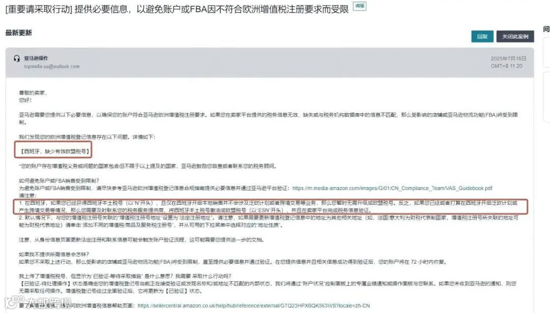 就在最近,大量亚马逊西班牙站卖家收到平台紧急通知,要求提供有效的欧盟税号(VAT-ROI)。这不是普通的平台规则调整,而是欧盟税改的关键执行步骤,将直接影响卖家的账户健康和销售权限!
