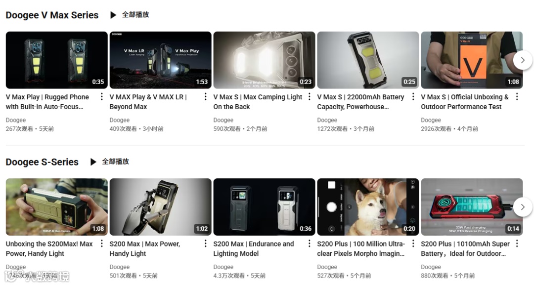 在YouTube,Doogee聚焦产品性能解说,围绕“产品展示+场景化体验”布局内容,突出耐用性、功能性及户外适配能力。
