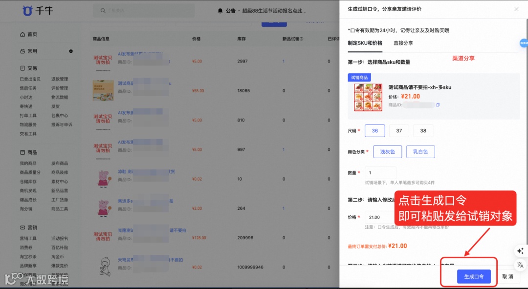第三步:点击生成口令,复制后发送给试销对象