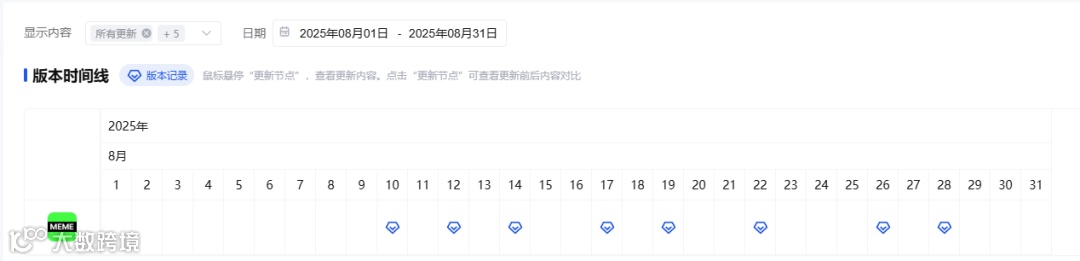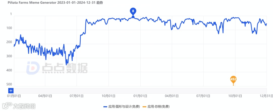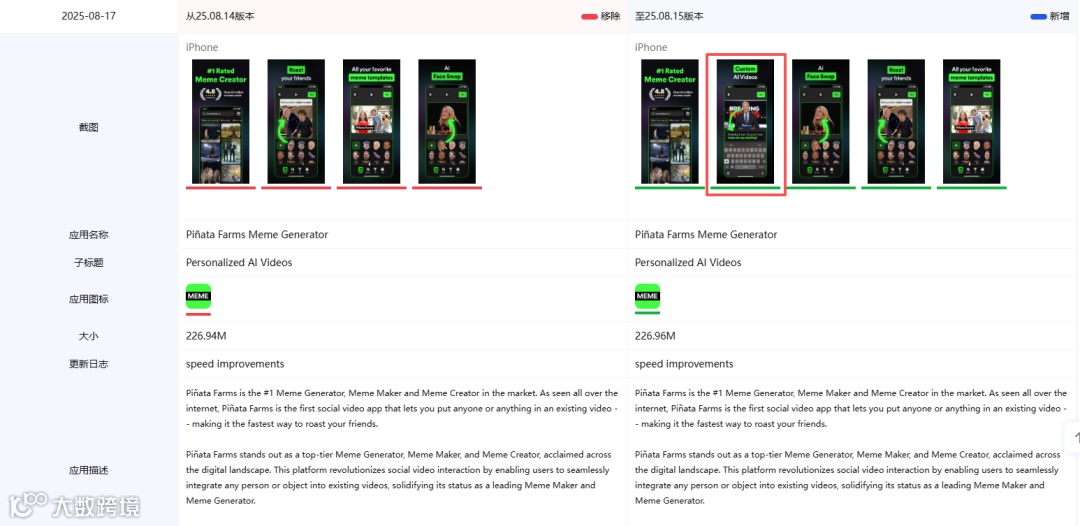 2024年8月,《Piñata Farms Meme Generator》密集更新8次,远超月均水平。其中8月7日版本将子标题由“Add text to images & videos!”改为“Personalized AI Videos”,并更新首页图突出AI搜索优化;8月15日进一步新增AI生成视频功能说明,显著提升AI在产品中的权重。