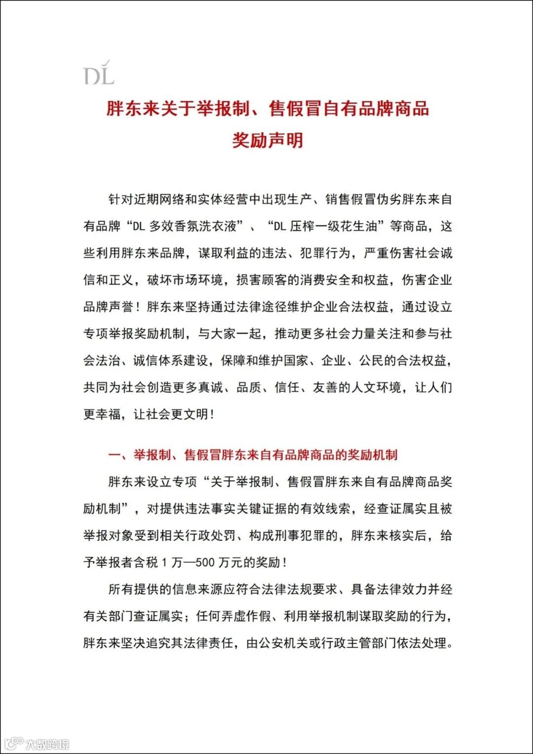 9月1日,胖东来通过官方社交媒体发布《关于举报制、售假冒自有品牌商品奖励声明》,针对近期出现的生产、销售假冒伪劣“DL多效香氛洗衣液”“DL压榨一级花生油”等侵权行为,正式设立专项举报奖励机制。
