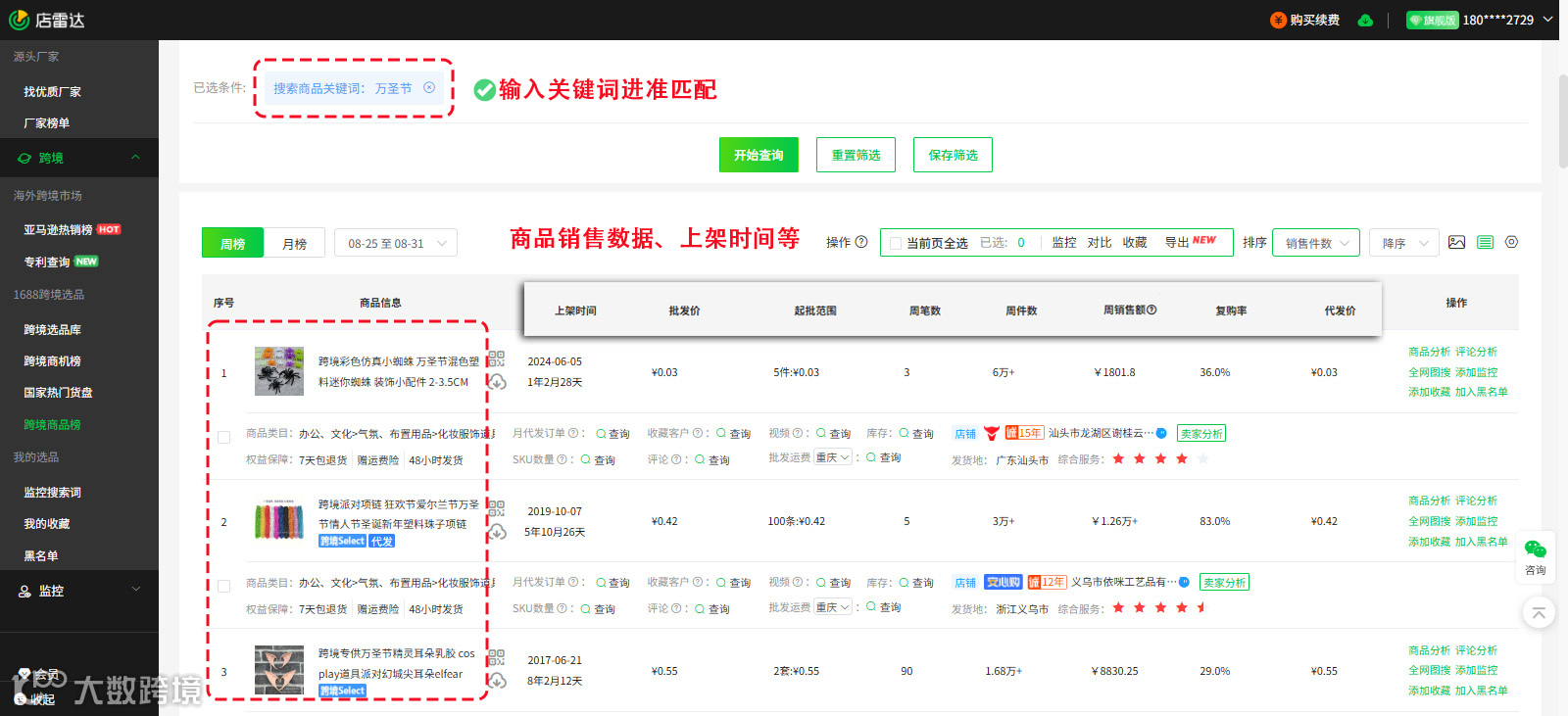 秋季大促的核心在于 “提前节日采购”,很多消费者会为此后的万圣节、感恩节、圣诞节及新年做准备。卖家可通过店雷达跨境选品工具,进入1688跨境选品挖掘近期爆品,可输入”万圣节“、”圣诞节“等关键词来精准匹配商品,例如在跨境商品榜中发现近期万圣节装饰、配饰较为热销,侧面反映出下游市场的偏好的需求,及时跟进上架。