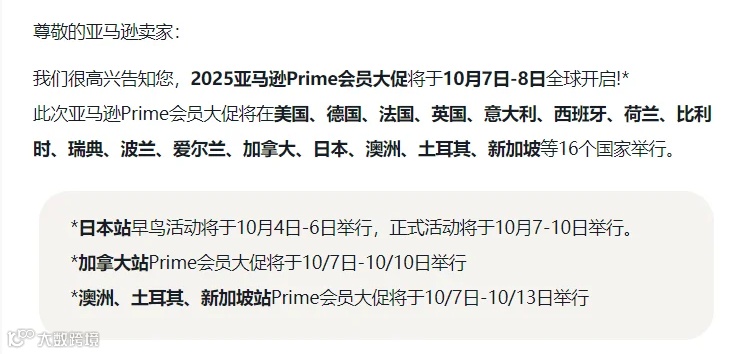 日前,不少亚马逊卖家收到消息:2025亚马逊Prime会员大促定档10月,这意味第四季度旺季第一枪正式打响。本期店雷达将深入分析大促核心政策及选品策略,助力卖家高效备战!
