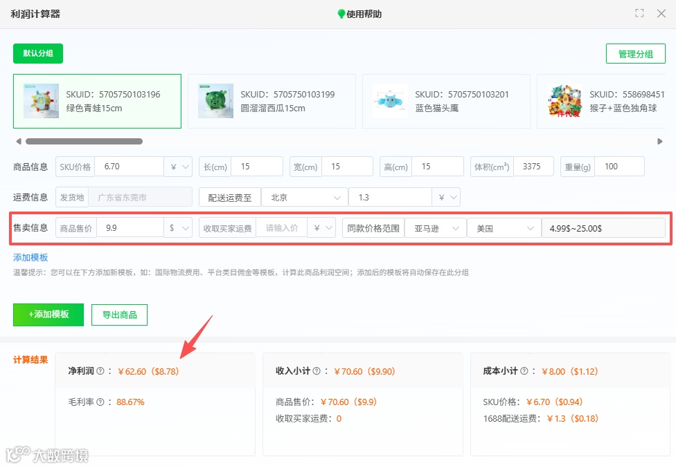 在通过店雷达1688插件初步核算利润空间,例如这款宠物玩具在1688上进货价为6.7元人民币,假设在亚马逊售卖9.9美元,毛利率高达88.67%,利润较高。
