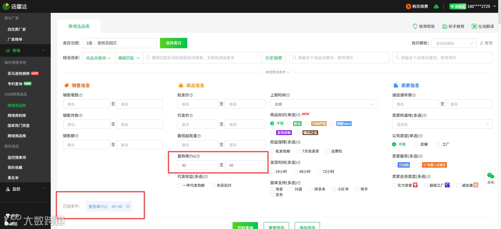 选品时,卖家可以优先选择复购率高、利润稳定的核心商品。这些商品在日常销售中过程中已经积累了一定的口碑与客户基础,在大促期间更易借助流量优势实现销量爆发。通过跨境选品库进行条件筛选,复购率可以根据不同品类多提升20%(如平常值在20%,大促期间可以提高供应商要求至40%)。