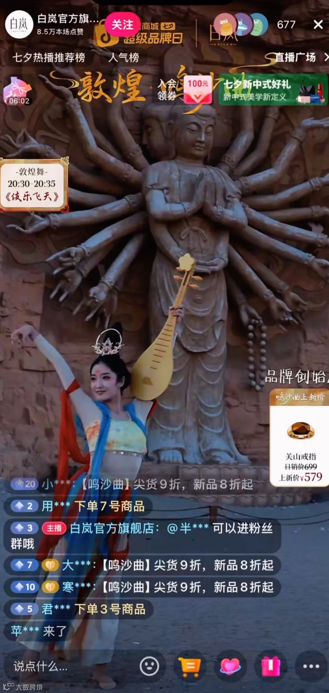 白岚则把直播搬到了敦煌,在大漠中实景实拍,以沉浸式沙漠场景、敦煌舞再现首饰背后的自然与文化意向,观众进入直播间,看到的不只是饰品本身,而是一段千年文明在当下的续写。