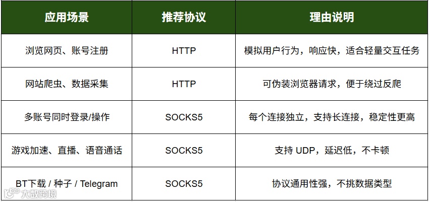 ▎实际使用场景怎么选?网页类任务优先选HTTP,复杂流量、高并发、长连接类任务就选SOCKS5。